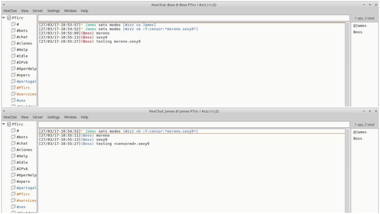 | Steps To Reproduce | a) Enter a channel b) Type: /mode #chan +b ~T:censor:*moreno.sexy9* c) Type moreno.sexy9 with another user and send the message to the channel d) It should appear on channel like: <censored>.sexy9 | ||||