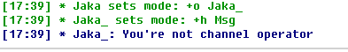 | Description | [17:39] * Jaka sets mode: +o Jaka_ [17:39] * Jaka_ sets mode: +h Msg [17:39] * Jaka_: You're not channel operator | ||||