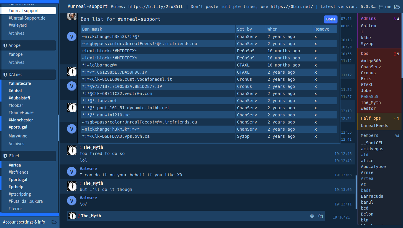| Description | Recently, I've found out on #unreal-support that some extbans were being shown duplicated/ /* "/MODE #unreal-support +b" with weechat */ 19:00:17 -- [#unreal-support] [1] *!*@Clk-D6DFD7AD.vps.ovh.ca banned by Syzop on Sun, 17 May 2020 18:35:06 19:00:17 -- [#unreal-support] [2] ~nickchange:h3km3k*!*@* banned by ChanServ on Mon, 20 Jan 2020 17:34:57 19:00:17 -- [#unreal-support] [3] ~msgbypass:color:UnrealFeeds!*@*.ircfriends.eu banned by ChanServ on Mon, 20 Jan 2020 17:34:57 19:00:17 -- [#unreal-support] [4] *!*@*.danwin1210.me banned by ChanServ on Mon, 20 Jan 2020 17:34:57 19:00:17 -- [#unreal-support] [5] *!*@*.pool-101-51.dynamic.totbb.net banned by ChanServ on Mon, 20 Jan 2020 17:34:57 19:00:17 -- [#unreal-support] [6] *!*@*.fagz.net banned by ChanServ on Mon, 20 Jan 2020 17:34:57 19:00:17 -- [#unreal-support] [7] *!*@Clk-6B711C32.vectr0n.com banned by ChanServ on Mon, 20 Jan 2020 17:34:57 19:00:17 -- [#unreal-support] [8] *!*@97371B7.71005B2A.8B1D2877.IP banned by Cronus on Sat, 30 May 2020 20:57:30 19:00:17 -- [#unreal-support] [9] *!*@Clk-8CCE6006.cust.vodafonedsl.it banned by Cronus on Sat, 30 May 2020 20:58:45 19:00:17 -- [#unreal-support] [10] *!*@*.C612985E.7DA59F9C.IP banned by .. on Mon, 01 Jun 2020 22:26:25 19:00:17 -- [#unreal-support] [11] *!~lalbornoz@* banned by .. on Tue, 29 Jun 2021 13:18:30 19:00:17 -- [#unreal-support] [12] ~text:block:*#MIDIPIX* banned by PeGaSuS on Tue, 29 Jun 2021 13:23:29 19:00:17 -- [#unreal-support] [13] ~text:block:*#MIDIPIX* banned by PeGaSuS on Tue, 29 Jun 2021 13:23:29 19:00:17 -- [#unreal-support] [14] ~msgbypass:color:UnrealFeeds!*@*.ircfriends.eu banned by ChanServ on Mon, 20 Jan 2020 17:34:57 19:00:17 -- [#unreal-support] [15] ~nickchange:h3km3k*!*@* banned by ChanServ on Mon, 20 Jan 2020 17:34:57 19:00:17 -- [#unreal-support] End of Channel Ban List /* "/MODE #unreal-support +b" with Hexchat */ [17/04/2022 - 19:09:53] * #unreal-support: *!*@*.C612985E.7DA59F9C.IP on Mon Jun 1 22:26:25 2020 by .. [17/04/2022 - 19:09:53] * #unreal-support: *!*@Clk-8CCE6006.cust.vodafonedsl.it on Sat May 30 20:58:45 2020 by Cronus [17/04/2022 - 19:09:53] * #unreal-support: *!*@97371B7.71005B2A.8B1D2877.IP on Sat May 30 20:57:30 2020 by Cronus [17/04/2022 - 19:09:53] * #unreal-support: *!*@Clk-6B711C32.vectr0n.com on Mon Jan 20 17:34:57 2020 by ChanServ [17/04/2022 - 19:09:53] * #unreal-support: *!*@*.fagz.net on Mon Jan 20 17:34:57 2020 by ChanServ [17/04/2022 - 19:09:53] * #unreal-support: *!*@*.pool-101-51.dynamic.totbb.net on Mon Jan 20 17:34:57 2020 by ChanServ [17/04/2022 - 19:09:53] * #unreal-support: *!*@*.danwin1210.me on Mon Jan 20 17:34:57 2020 by ChanServ [17/04/2022 - 19:09:53] * #unreal-support: ~msgbypass:color:UnrealFeeds!*@*.ircfriends.eu on Mon Jan 20 17:34:57 2020 by ChanServ [17/04/2022 - 19:09:53] * #unreal-support: ~nickchange:h3km3k*!*@* on Mon Jan 20 17:34:57 2020 by ChanServ [17/04/2022 - 19:09:53] * #unreal-support: *!*@Clk-D6DFD7AD.vps.ovh.ca on Sun May 17 18:35:06 2020 by Syzop [17/04/2022 - 19:09:53] * #unreal-support: *!~lalbornoz@* on Tue Jun 29 13:18:30 2021 by .. [17/04/2022 - 19:09:53] * #unreal-support: ~text:block:*#MIDIPIX* on Tue Jun 29 13:23:29 2021 by PeGaSuS [17/04/2022 - 19:09:53] * #unreal-support: ~nickchange:h3km3k*!*@* on Mon Jan 20 17:34:57 2020 by ChanServ [17/04/2022 - 19:09:53] * #unreal-support: ~msgbypass:color:UnrealFeeds!*@*.ircfriends.eu on Mon Jan 20 17:34:57 2020 by ChanServ [17/04/2022 - 19:09:53] * #unreal-support: ~text:block:*#MIDIPIX* on Tue Jun 29 13:23:29 2021 by PeGaSuS [17/04/2022 - 19:09:53] * #unreal-support :End of Channel Ban List /* "/MODE #unreal-support +b" with IRCCloud */ Since IRCCloud displays those lists in a pop-up window, a screenshot was been attached | ||||